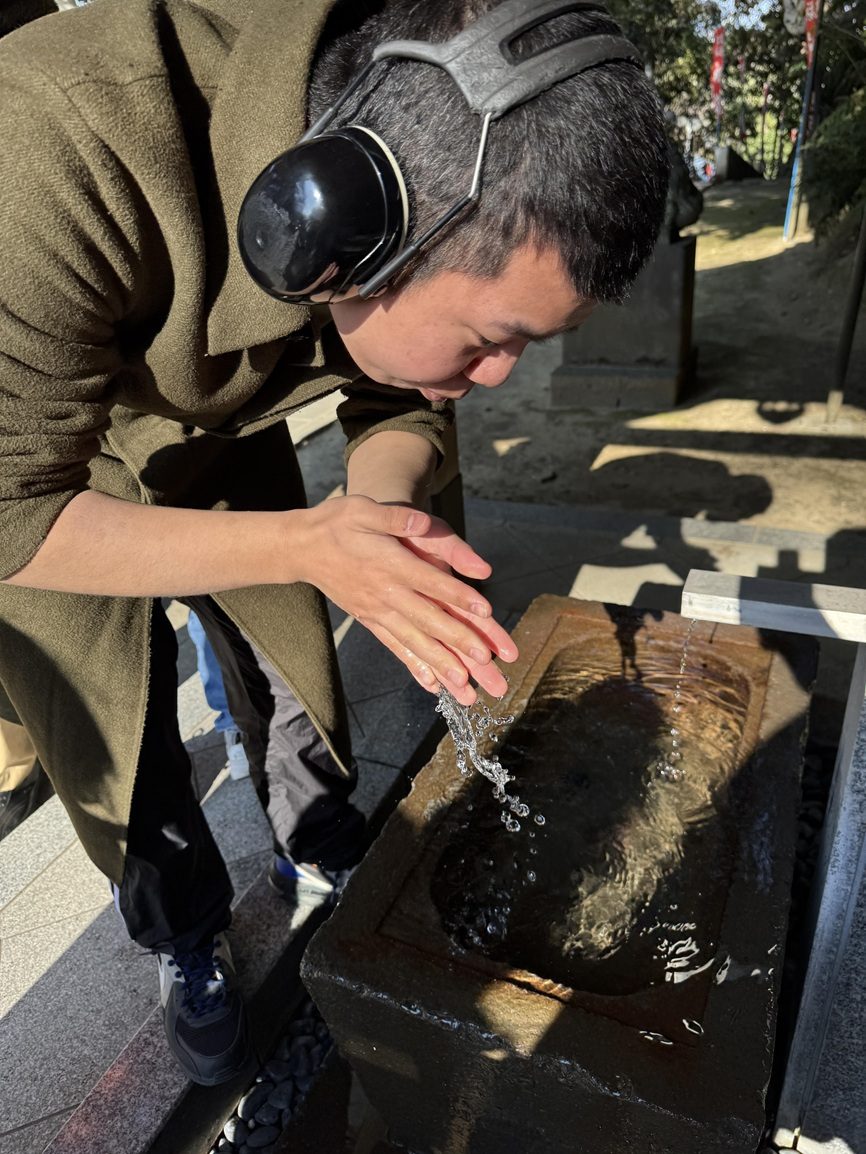 くまさんでお昼を食べたあとに、子どもたちは送迎車で参拝に行きました。子どもたちは、まず一礼して鳥居をくぐり、手水舎にて手を清める伝統的な作法から体験してもらいます。