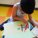 実は「座り続けられること」「机にきちんと向かえること」は、特に「多動」の子にとっては苦手な課題のですが、将来の就労のことを考えた時、これは大事な要素となります。公園や外で遊ぶことももちろん楽しいのですが、くまさん横浜ではそれだけではなく、こうした室内活動も重視しております。