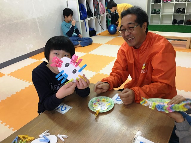 こちらは最近、小中生の活動で頻繁に行っている「洗濯ばさみのワーク」です。何かをはさむためには、親指と人差し指に力をぐっとこめて洗濯ばさみを開かないといけません。この作業は「指先の巧緻性」の基本的な訓練です。また、ただ開けばよいわけではなく、厚紙などを挟み込みますから、開いた口の「角度」を紙と上手に合わせないと挟めません。これがなかなか子どもたちにとっては難しいのですが、いったん始めると面白いらしく、ご覧のとおり真剣な表情で集中していきます。ふだん、お外で体を動かすのが大好きな元気な子たちが、こうした表情で座って課題をこなしている様子は、職員にとってもまた嬉しくかつ身が引き締まる時間です。