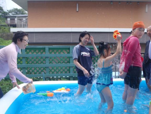くまさん横浜はビルの3Fにあるのですが、幸いなことに広い庭と水栓を大家さんに作っていただいていて、そこに大きなプールを出してやっています(ツバサビルの大家さん、ありがとうございます)。毎年子供たちにとても人気の活動で、当日は子どもたちもプールバッグを持参して喜んで来所します。