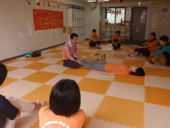 くまさん横浜では、栗本啓司先生(からだ指導室あんじん代表)を月に一回お招きして、職員の研修を行っています。この研修には保護者の方にも無料で解放しており、毎月ご参加いただいている保護者の方もいらっしゃいます。