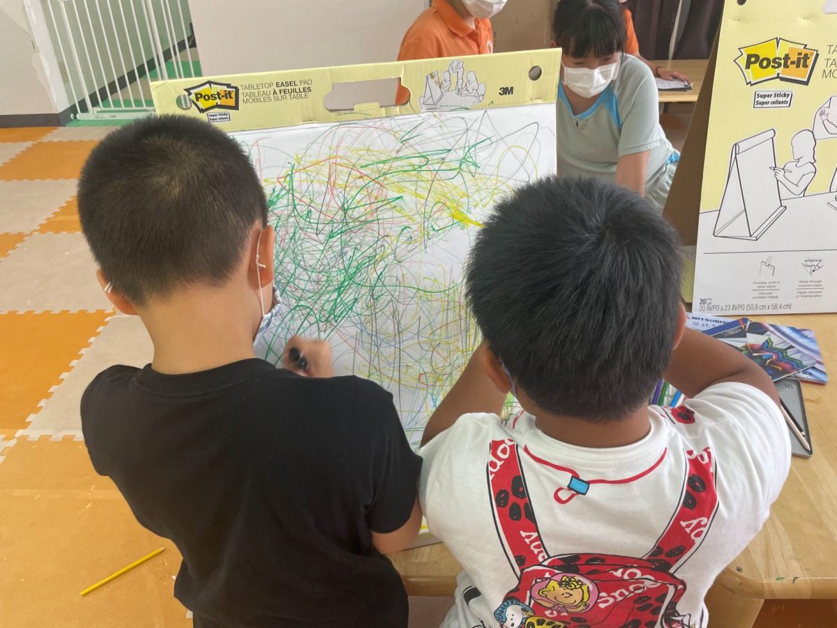 子どもたちにとっては「ちょっと難しい」お絵かきでしたが、ご覧のとおりみんな笑顔で自由にお絵かきを楽しみました。いろいろな形を書く子、色をたくさん使って塗りつぶしていく子、複数のペンを持って「同時に線が書ける」ことを楽しむ子・・・それぞれ大人にはない発想で、自由に紙の上に色や形を表現する楽しい時間となりました。