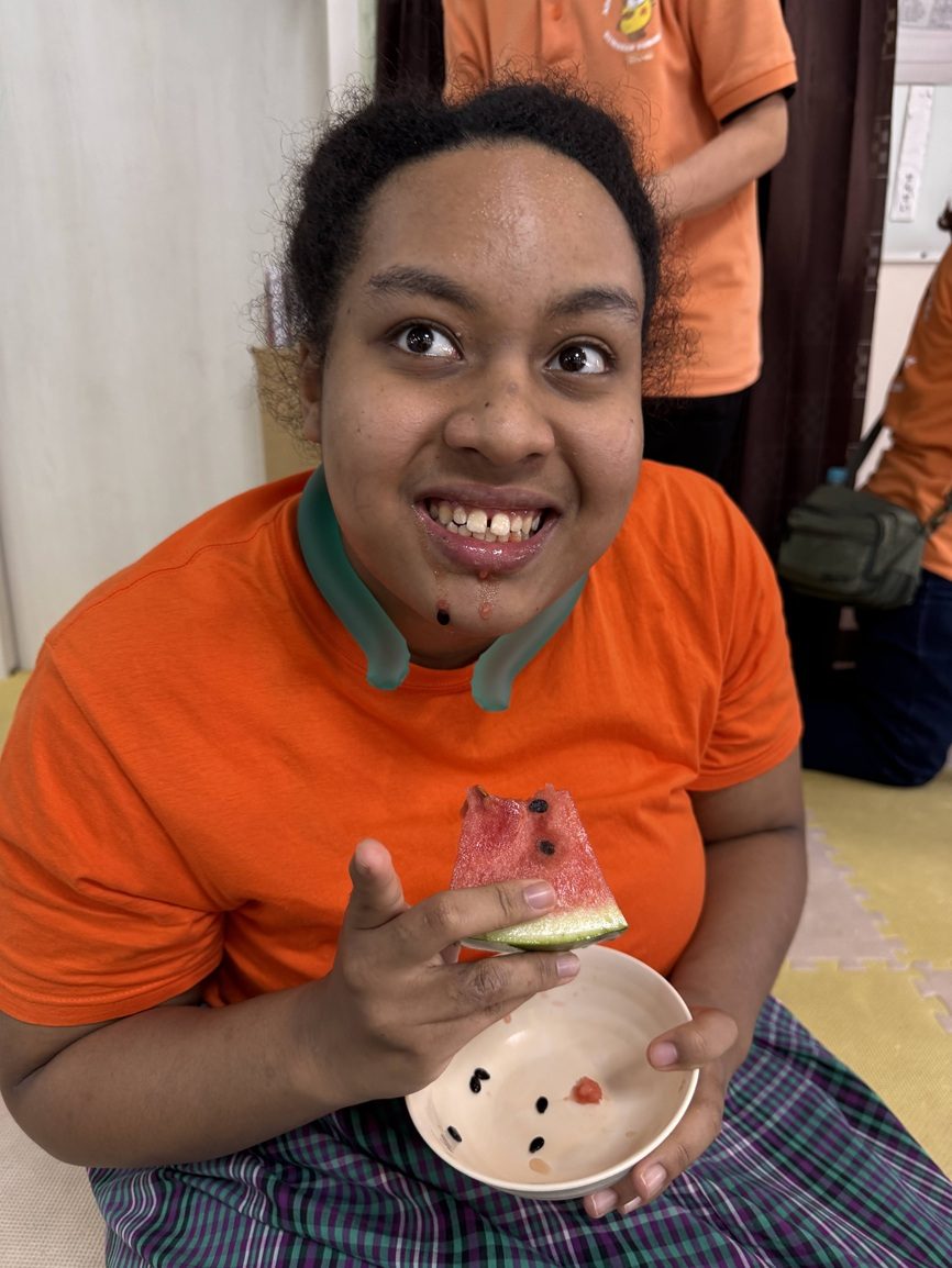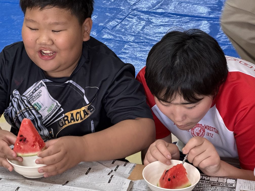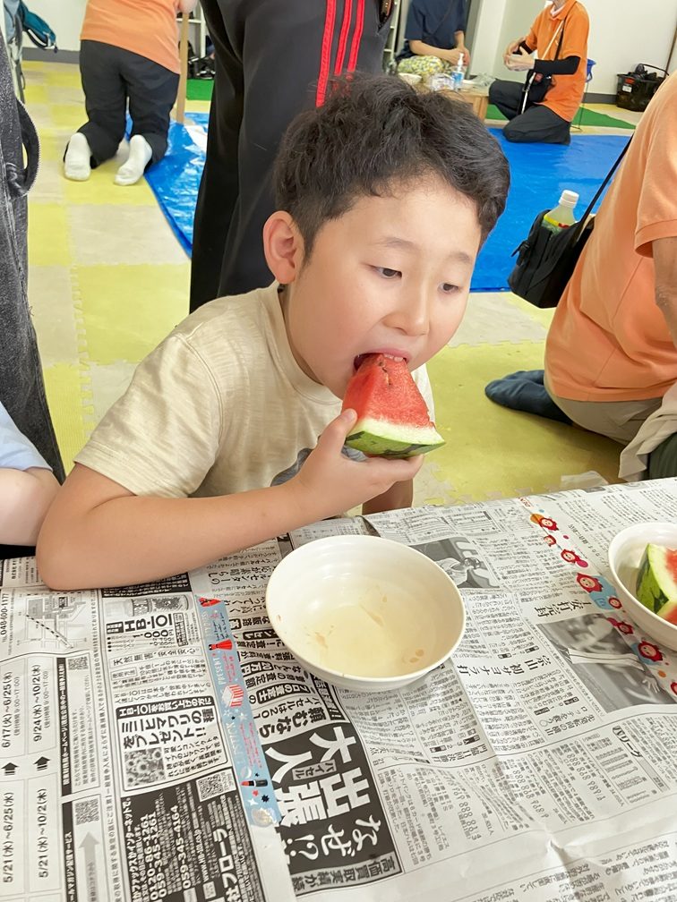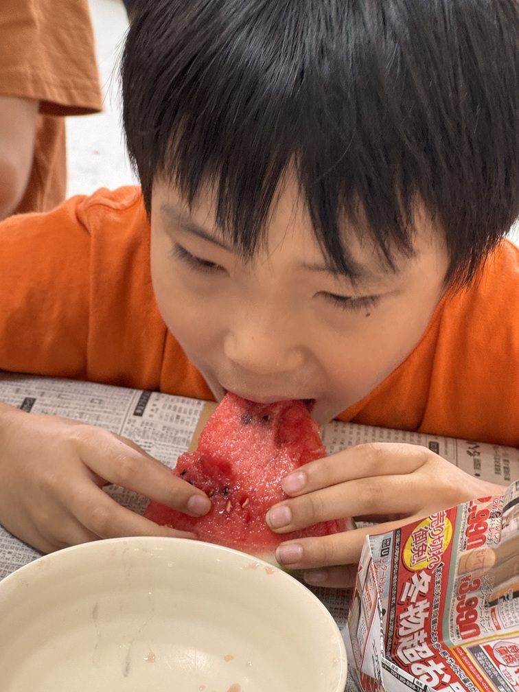 もちろん切ったスイカはそのままおやつです。みんなかぶりついて食べます。今回も横浜の近くの三浦産のスイカでしたが、甘くてジューシーで、みんなペロッと平らげました。