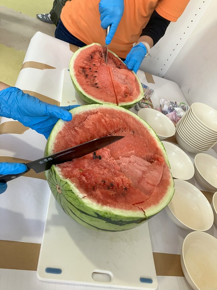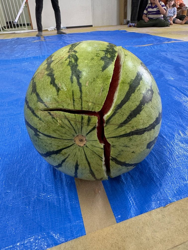 叩く「棒」は大きなポスター紙を固く巻いた紙の筒なのですが、それでも大きなお兄さん・お姉さんたちが力いっぱい叩くとスイカが割れます。ヒビが入ってジュースが出始めたところで試合終了。そこから先生たちがスイカを引き取り、さっと包丁を入れて食べやすく小さく切ります。