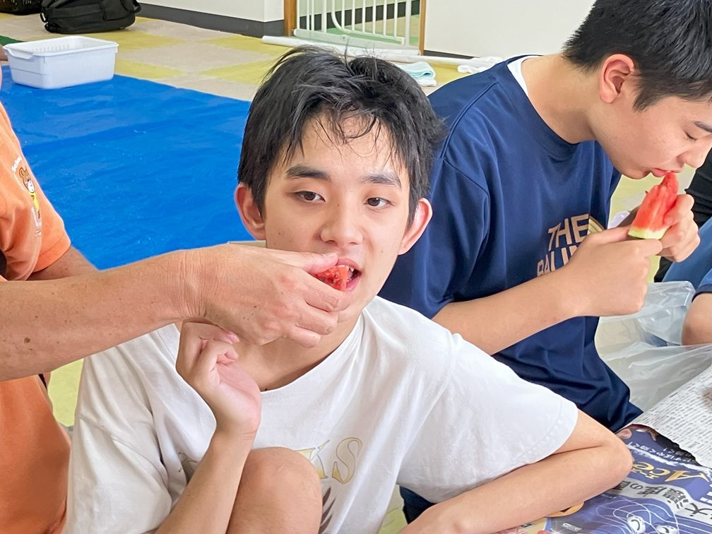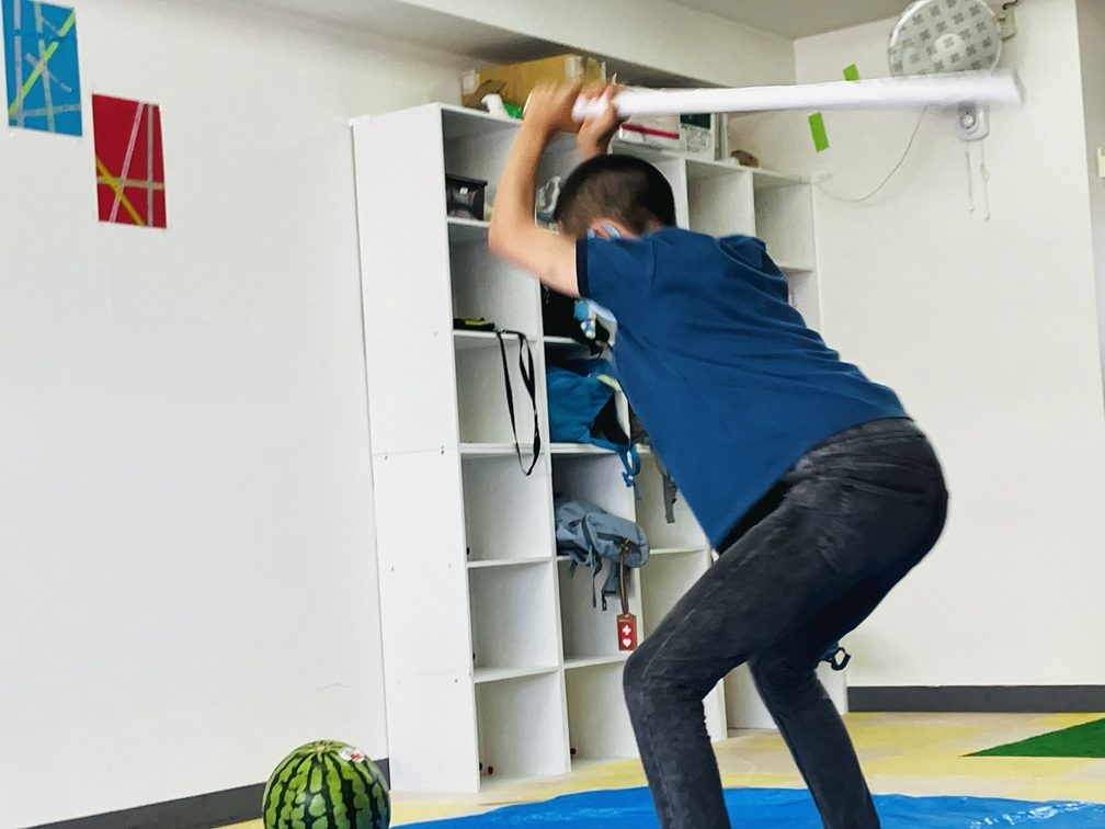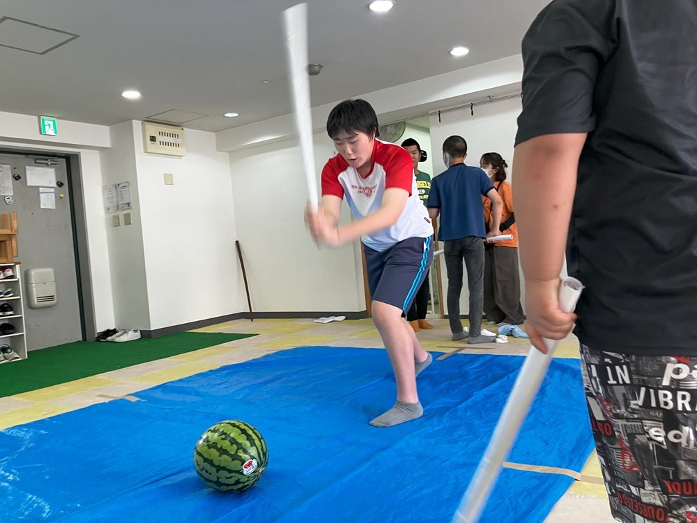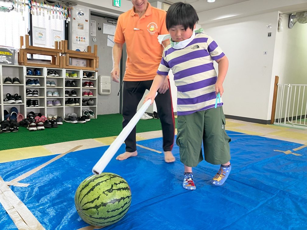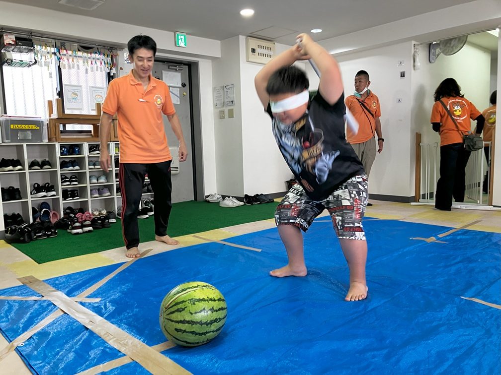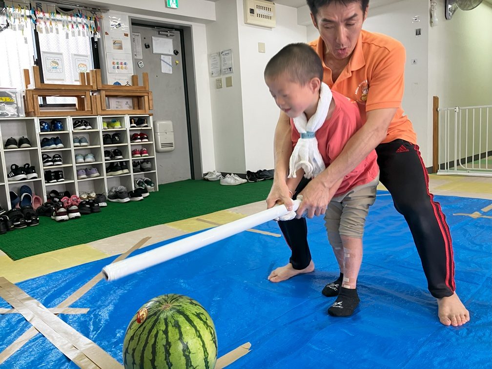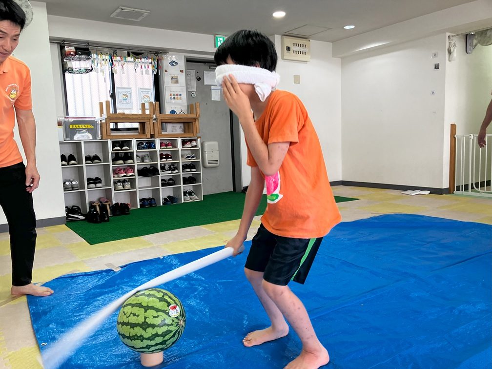 「目隠しをして歩きだけで距離を測る」動作は、身体意識と感覚の養成になります。身体周囲の空間認知能力を鍛えながら、季節のフルーツを美味しくいただく「スイカ割り」で、くまさんの夏休みも大いに盛り上がっています。