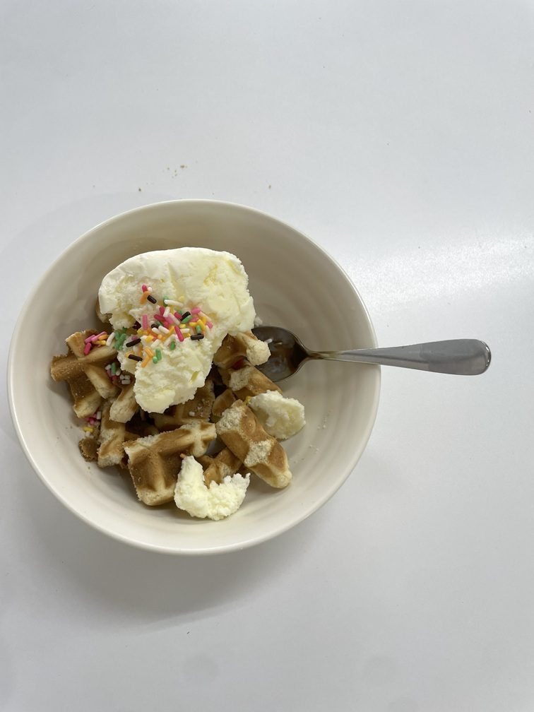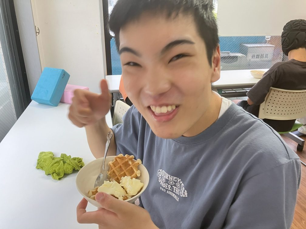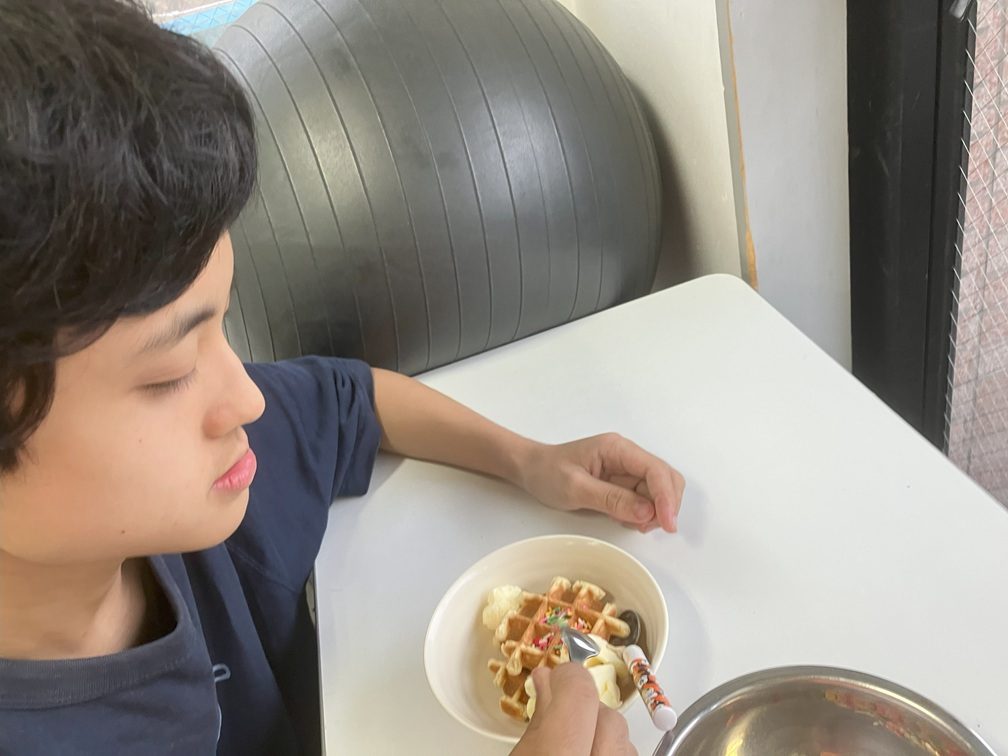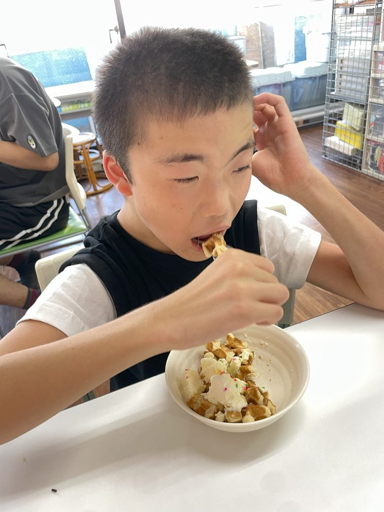 中高生のクラスでは、より高度なデコレーションに挑戦いたしました。ワッフルの上にアイスクリームを丁寧に盛り付け、チョコスプレーで美しく装飾することで、見た目にも楽しいおやつを完成させました。