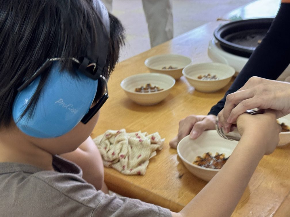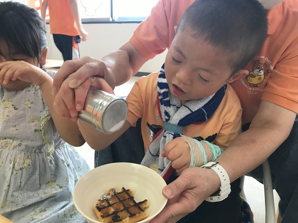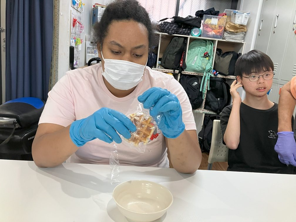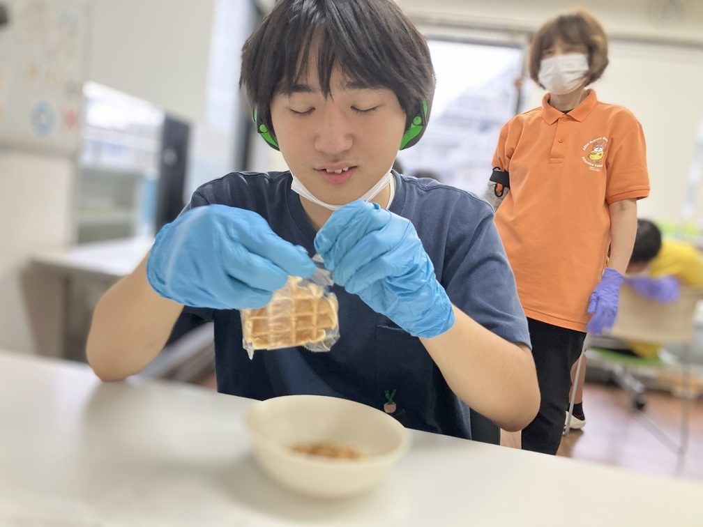 今回、このバニラワッフルは、秋の調理活動の貴重な材料となりました。くまさんでは「調理」も重要な訓練活動の一環として位置づけており、ワッフルは加工しやすい絶好の教材です。