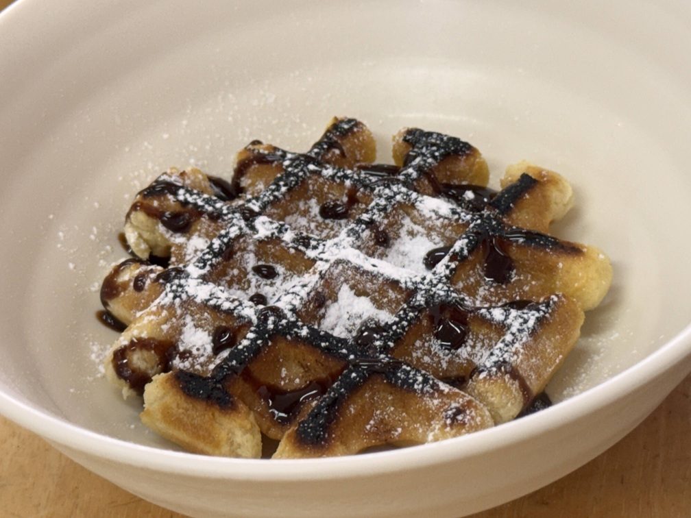 小学生のクラスでは、ワッフルを少量の牛乳に浸してから、子どもたちがホットプレートでこんがりと焼き上げました。仕上げに粉糖やチョコソースをかけることでさらにおいしくなり、子どもたちが調理の楽しさを存分に味わうことができました。
