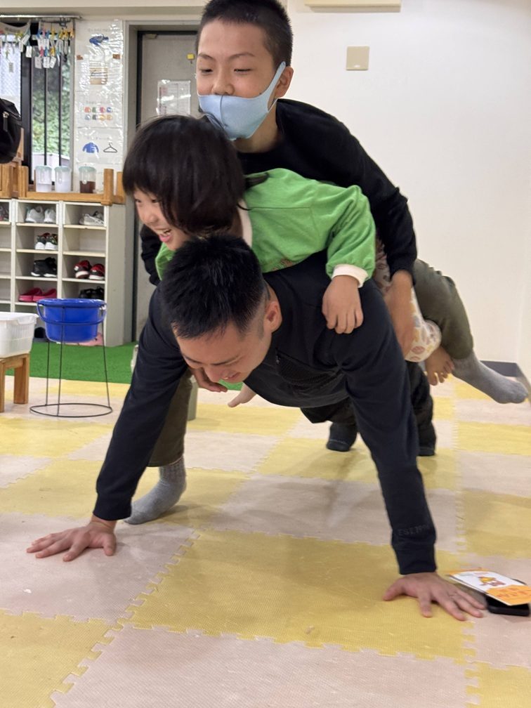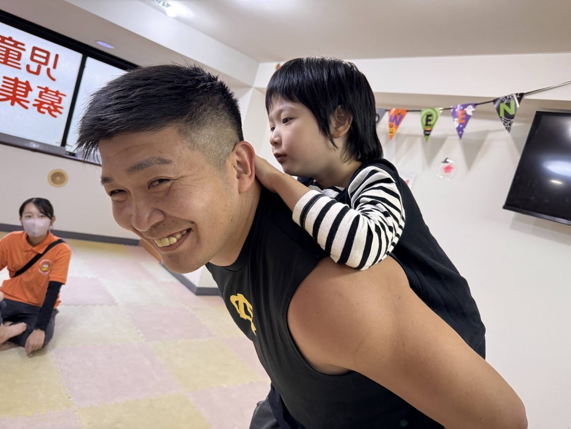 また男の子たちの何人かは選手の方の胸を借り、突進してぶち当たらせていただきました。が、選手の皆さんはびくともせず笑顔で受け止めていました。また、元気な子どもたちを背中に乗せて腕立て伏せされる選手の方もいて、皆さんの脅威の体力に驚きの声が上がりました。