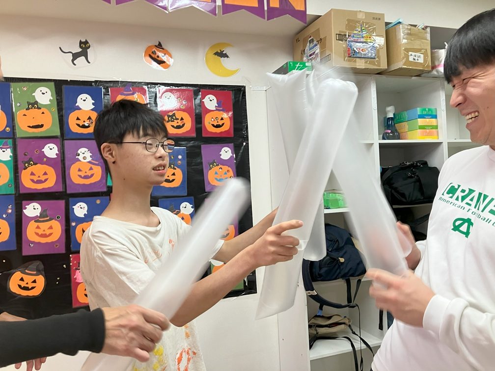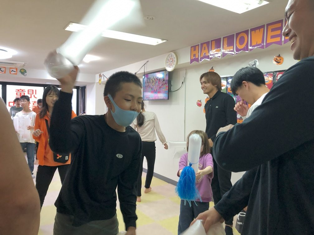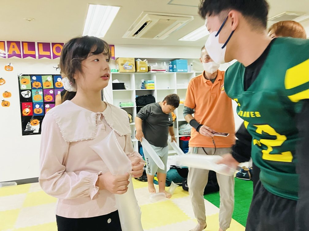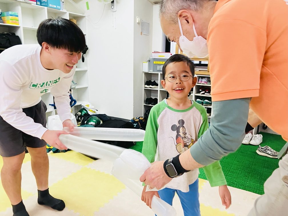 ふだんは子ども同士で楽しむ傘袋でのチャンバラですが、この日は特別です。大きな選手の皆さんがニコニコと真剣に(?)傘袋を持って子どもたちと打ち合う姿は、見ているだけでも微笑ましい楽しい時間でした。