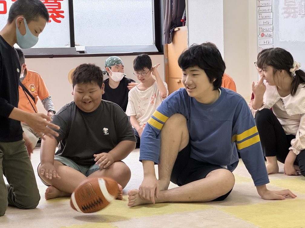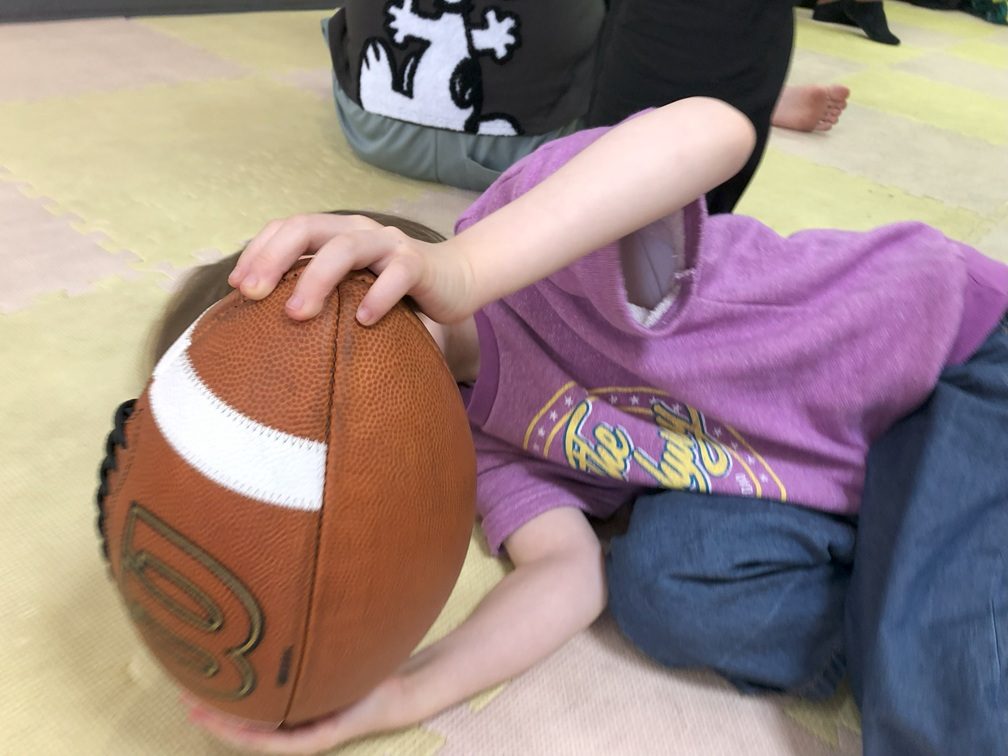 特に面白かったのは、アーモンド型のアメフトボールでのキャッチボールです。アメフトのボールは「バウンドするとどちらに飛ぶかわからない」という特徴があり、子どもたちが「難しいキャッチボール」の意外性に笑ってしまう場面が何度もありました。