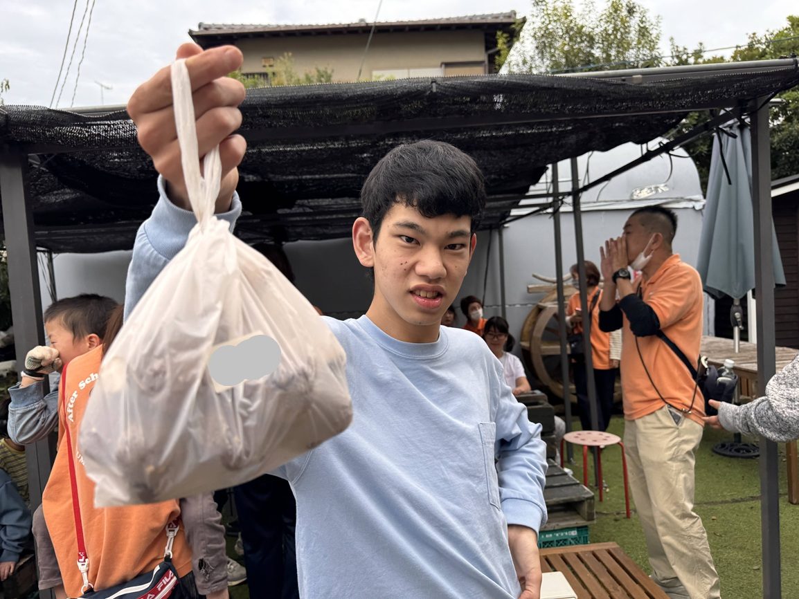 ぷにぷにして少しひんやりする感触がイヤでポイと投げてしまう子、根元の茎の部分(いしづき)から取らず、傘ばかりもぎ取る子もいたりして、テラスは一時大騒ぎとなりましたが(笑)、みんな自宅へお土産にするシイタケを無事に自分の袋に取ることができました。