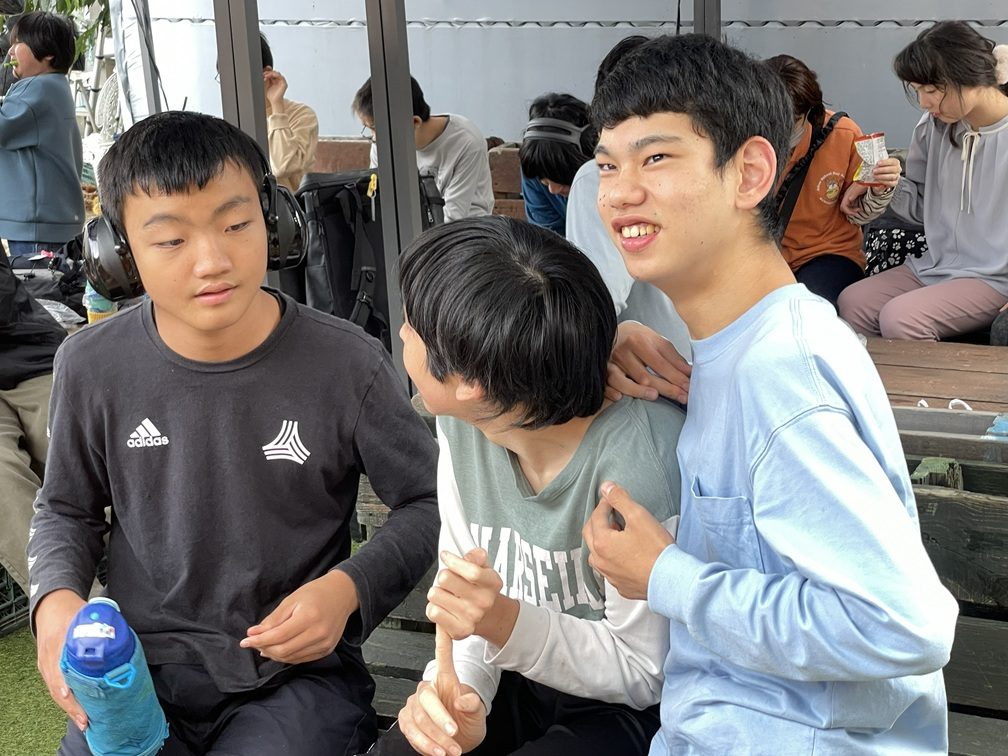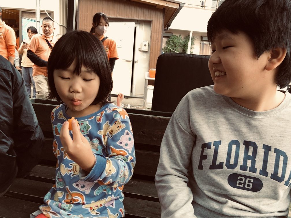 収穫が終わったらテラス席をお借りしておやつタイムです。持ち込んだお菓子を水筒のお茶と一緒に外でいただくのはちょっとしたピクニック気分で、子どもたちからも笑顔がこぼれました。。当日は前日まで雨で開催が危ぶまれましたが、無事に雨が上がってくれて楽しい遠足となりました。