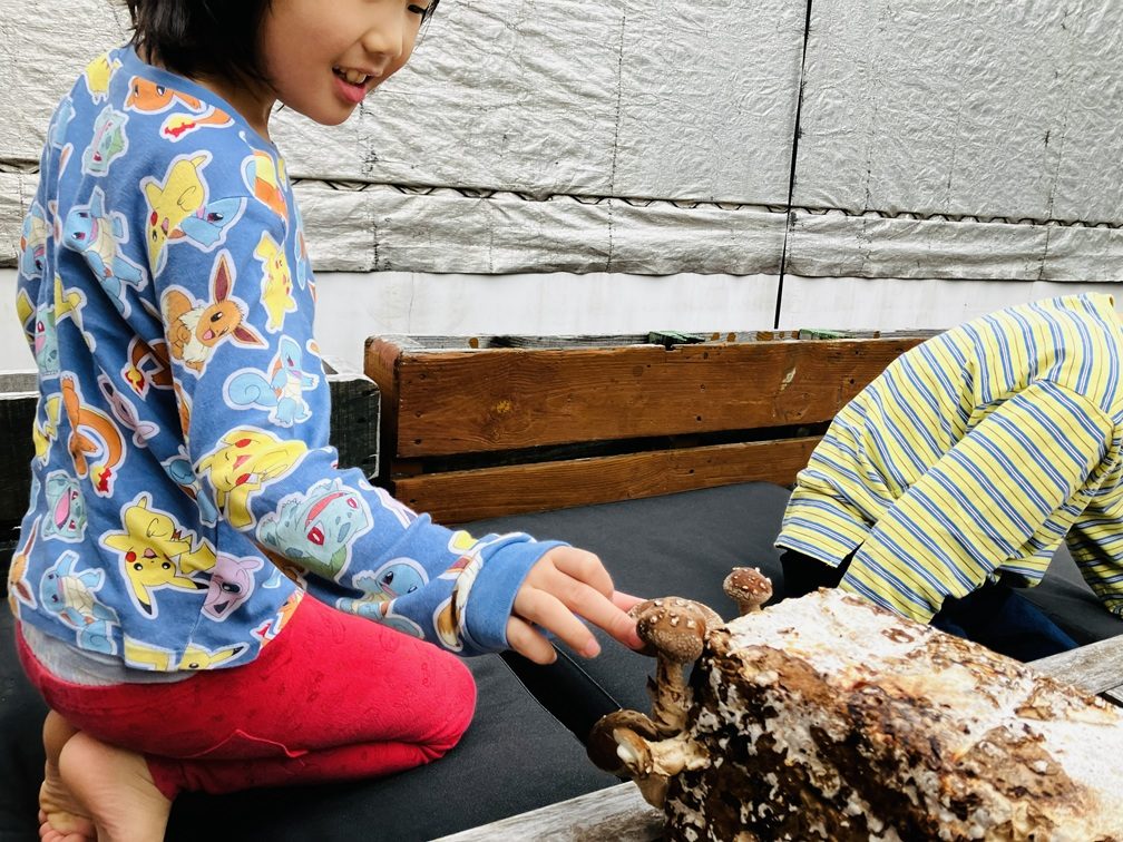 子どもたちは初めて見る「生えているシイタケ」にはじめはビックリ。なかなか手が出ない子、じーっと見つめる子などもいましたが、もぎ取り方を教えてもらうと、楽しいようで次々と取り始めてくれました。