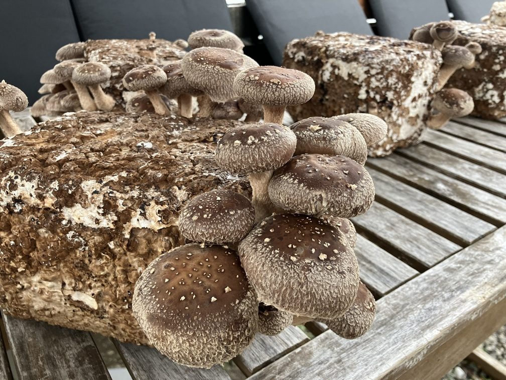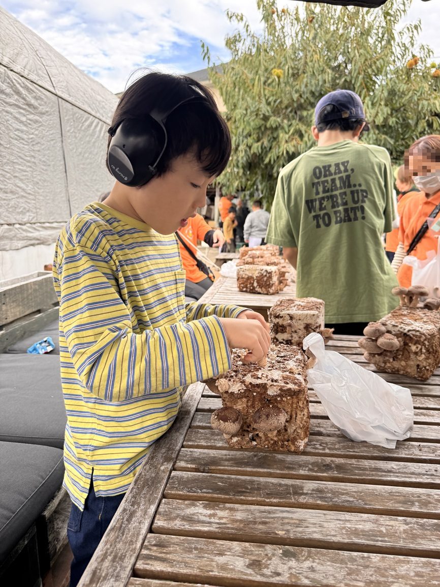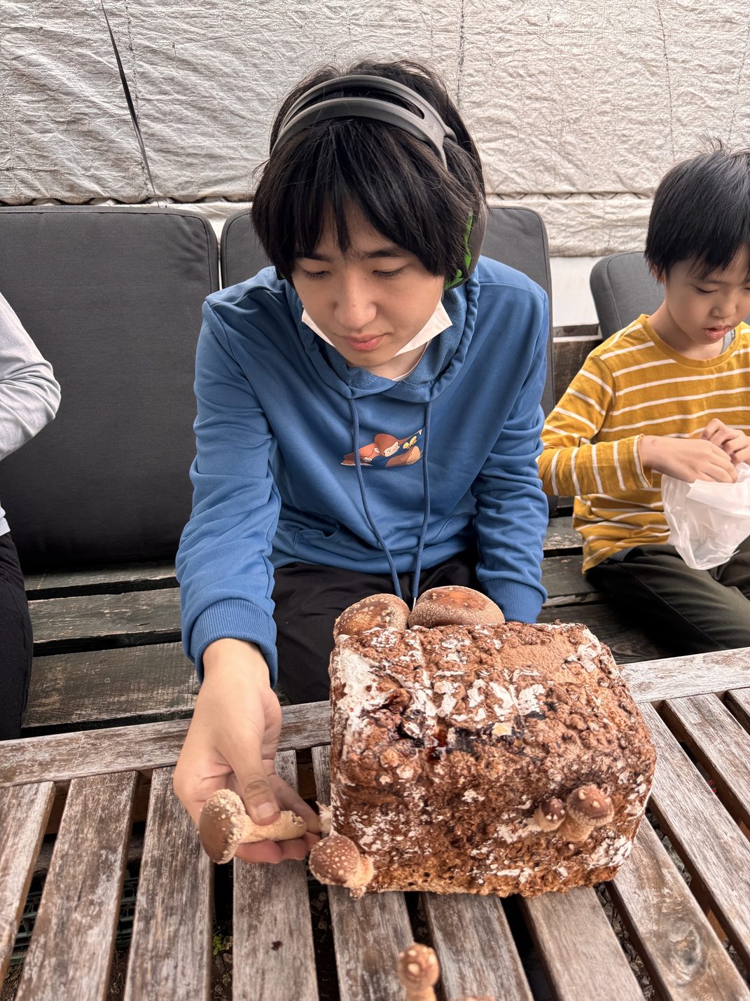 そのブロックからニョキニョキと生えているシイタケをもぎ取るのですが、本来ならばビニールハウスの中で棚に並べられているその菌床を、当日は子どもたちのためにわざわざハウスから出していただき、外のテラスで収穫体験をさせていただきました。