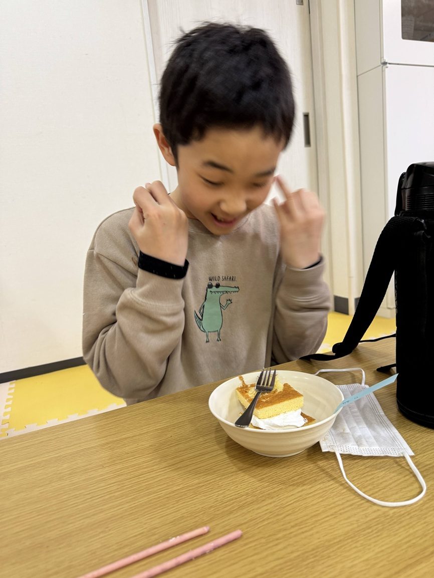 ちょうどおやつタイムにお越しいただいたので、サンタさんたちにも子どもたちのおやつにご参加いただきました。今週は、子どもたちお手製の「クリスマスケーキ」です。サンタさんたちにケーキと麦茶でおもてなしし、職員や子どもたちと一緒に楽しく召し上がっていただきました。