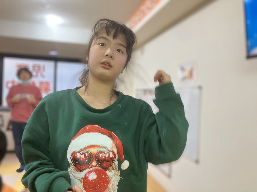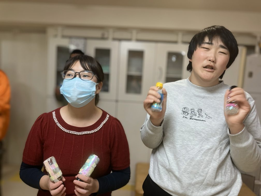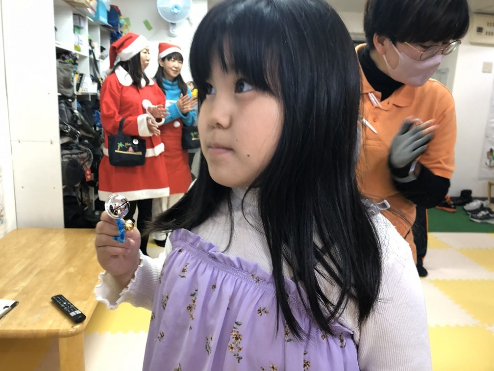 そしておやつが終わったら、一緒に歌う「お歌の時間」です。今年はこの日のために小学生たちは「鈴」を、中高生たちは「マラカス」を作っており、クリスマスソングに合わせて振ってリズムを取りました。サンタさんたちも一緒に歌っていただき、温かいパーティーとなりました。