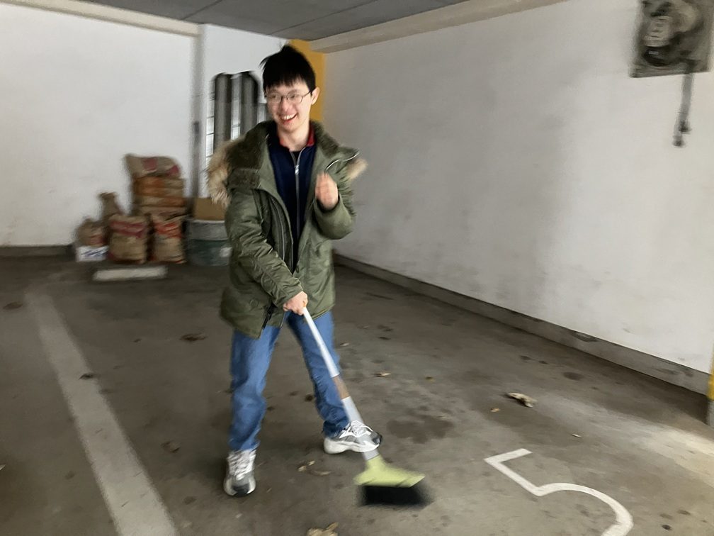 そして中高生たちは駐車場の床も掃除しました。コンクリの床はホウキで掃き、排水口に溜まった落ち葉やゴミも取り除きました。