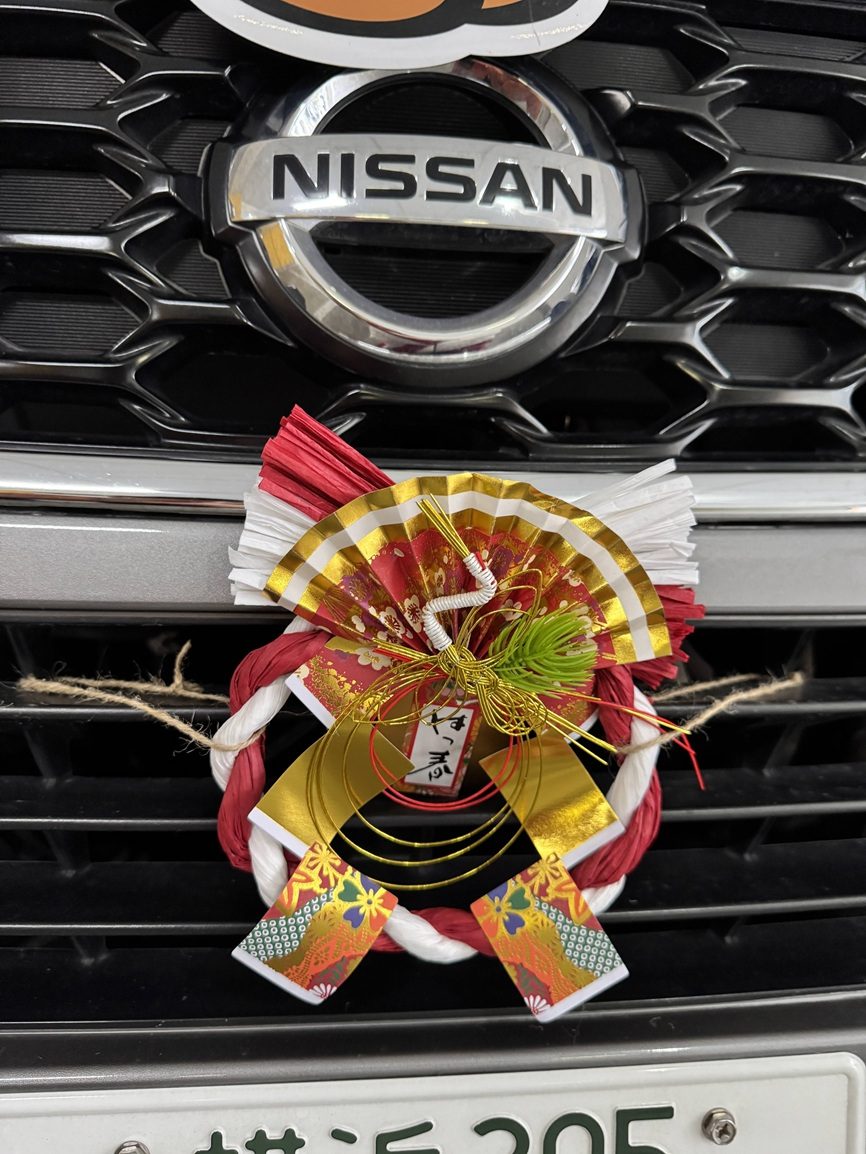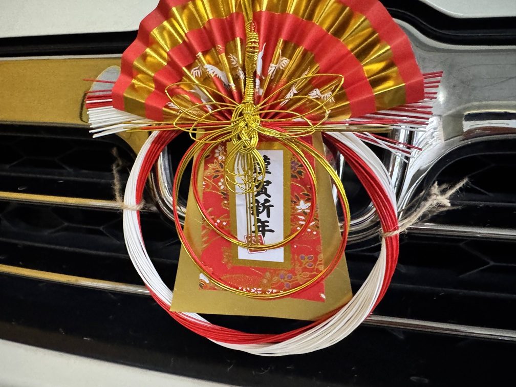 次は正月飾りです。最近は正月飾りをつけて走る車も少なくなりましたが、くまさんではこれも「日本の季節の行事」と考えており、毎年、松の内は送迎車に正月飾りをつけて走っています。
