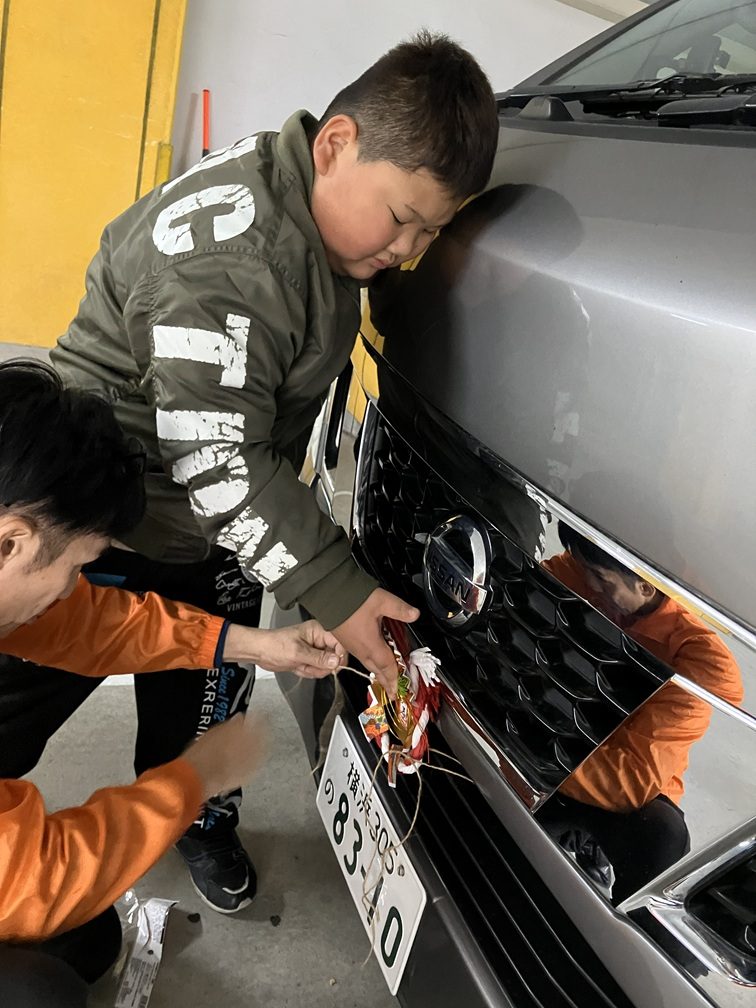 フロントグリルの正面に麻縄で縛ってつけていくのを子どもたちにも手伝ってもらいます。職員に手を添えられながらも「ちょうちょ結び」「固結び」などでつけていきます。みんな興味深そうに眺めていました。