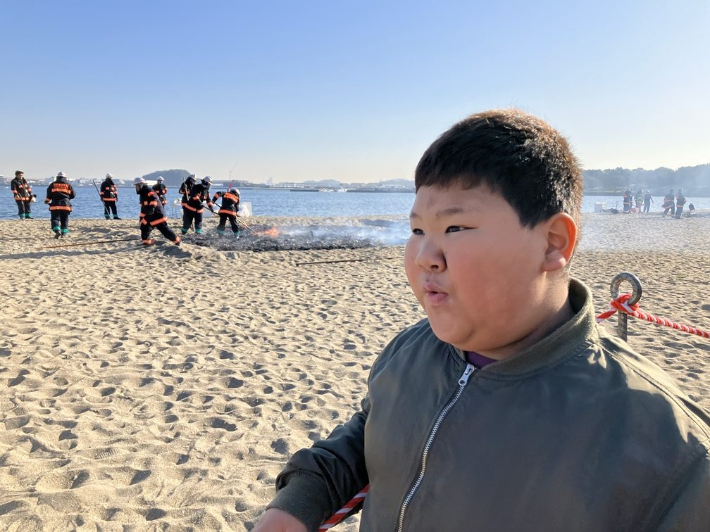 当日は、浜辺で大きな焚き火をしている会場の雰囲気や地域の方々の様子に、子どもたちも自然と背筋が伸びるようで「ふだんとは少し違う行事の空気」を感じ取っている様子が見られました。伝統行事に触れることは、ただ知識として学ぶだけでなく、その場の音や匂い、人の動きも含めて五感で「場」を体験する貴重な学びだと改めて感じます。