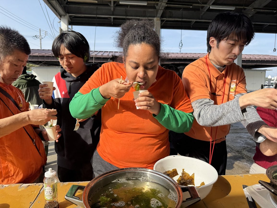 箸で取ってお湯につけた途端、茶色かったワカメがさっと鮮やかな緑色になり、おーと言う声が上がります。さっそく手元の紙コップに入れたポン酢につけて食べると・・・そのワカメの何とおいしいこと!