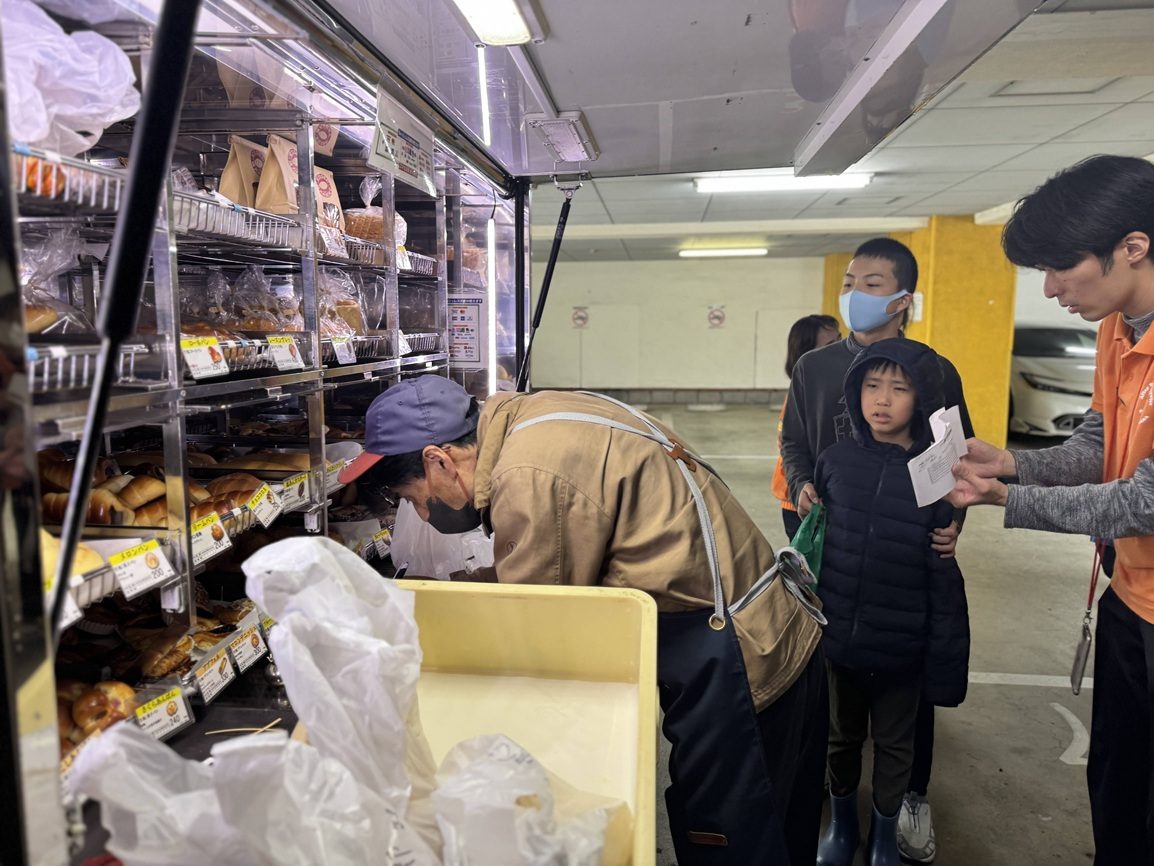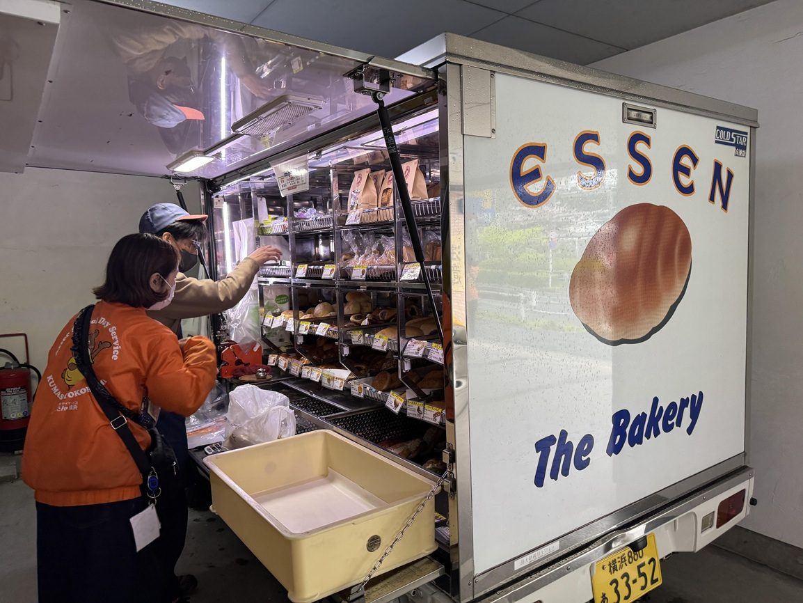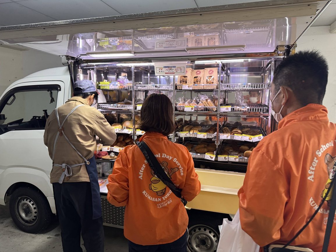 当日は、午前中に焼いたばかりの焼きたてパンをたくさん積んだ販売車が、ちょうどお昼頃にくまさんの駐車場に到着。横の扉が開くと、棚いっぱいにずらりと並んだパンが見え、子どもたちも職員も思わず笑顔になりました。