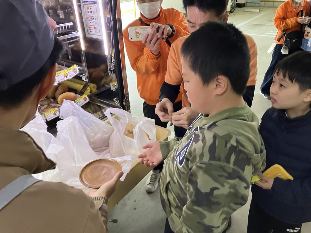 甘いパンや惣菜パンだけではなく、クッキーやピザまであり、たくさんの種類のパンが並んでいます。子どもたちは、パンを買いに3Fの教室から1Fの駐車場に職員と一緒に降りていきます。そして財布からお金を出して店員さんにお渡しし、パンを受け取るという一連の「お買い物」の流れを体験しました。